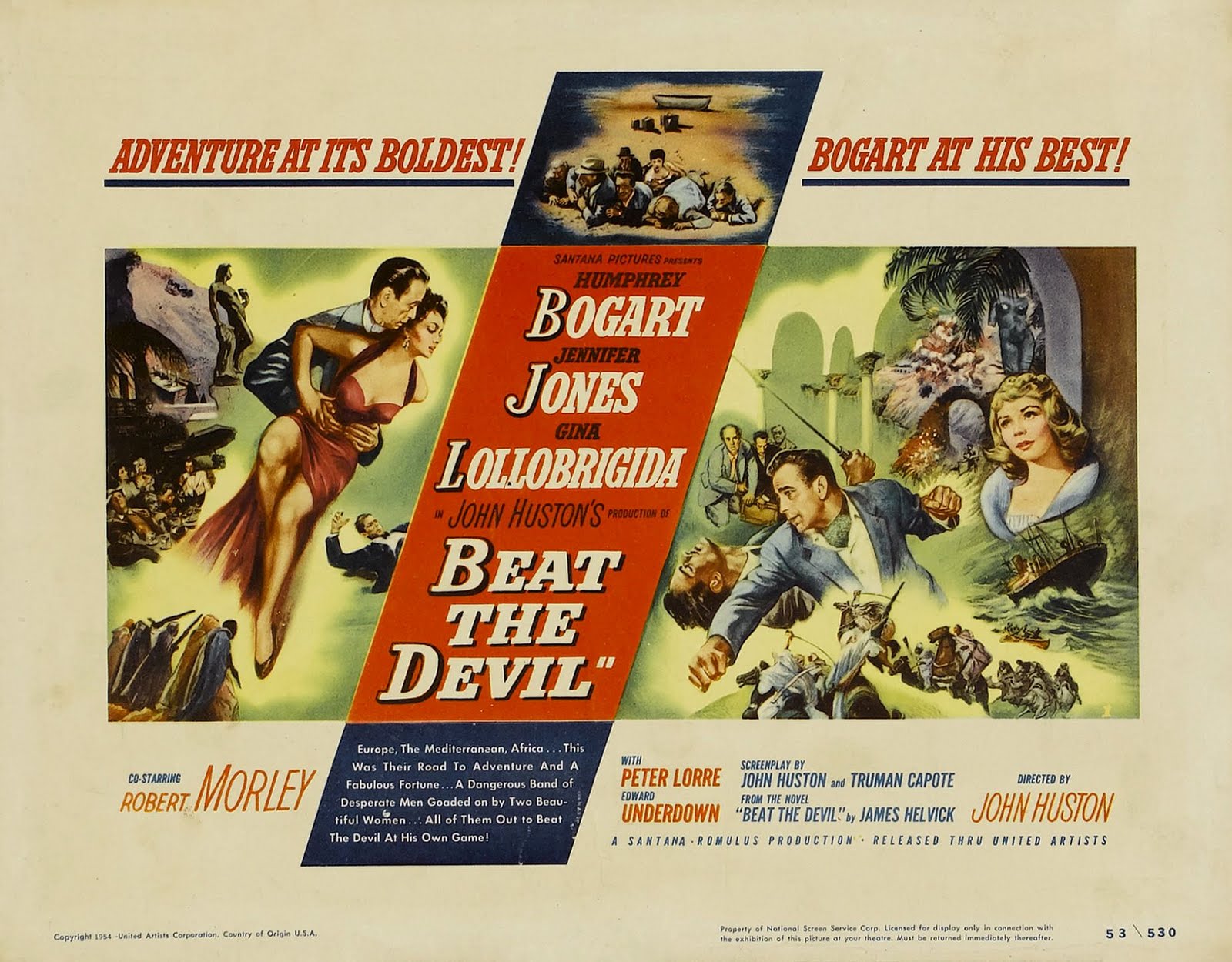 Beat The Devil is the story of a group of desperate types in Italy who are plotting to get to Africa for a make it rich scheme, but on the way fall in with a British couple who complicate matters. There’s a plot involving uranium which may or may not exist, and Bogart being the love interest of two gorgeous women, as well.