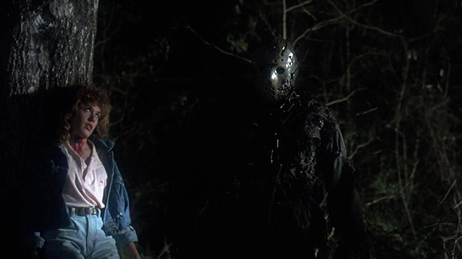 Opening directly where the last film finished, this continues the story, this time with Jason rising, and ready to take revenge. Of course, since he clearly didn’t drown in the lake in childhood, the revenge is now for the killing of the person who was revenging his death… which is a bit of a skewed motivation, but trust me, you won’t care. No famous faces here, just plenty of ketchup soaked deaths as Jason stalks and murders the guests of a training camp for camp counselors that’s conveniently also on Crystal Lake. He wears a canvas bag over his head, and is a huge lumbering presence, and we learn more about him in this film, but still no hockey mask… We do get to see where he lives though, his creepy shack and personal altar, plus the terrifying face behind the mask.